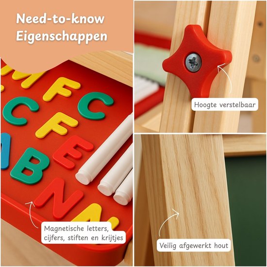 Een geweldige educatief tekenbord voor elk klein kindje. Dit schoolbord is gemaakt van hout en staat garant voor veel plezier! Dit multifunctionele leerbord stimuleert de verbeeldingskracht en creativiteit en traint de technische vaardigheden van kinderen. Het bord vermaakt niet alleen maar leert ook geduld, het ontwikkelt concentratie en geheugen en leert zelfs de eerste letters en cijfers.