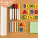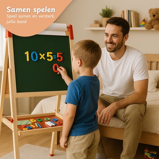Het frame van het multifunctionele leerbord is volledig gemaakt van hout; alles is perfect gepolijst en veilig voor kinderen. Het bord heeft een klassiek telraam met parels waarmee het telavontuur kan beginnen. Vervolgens kan het kind wiskundige basisactiviteiten oefenen zoals optellen, aftrekken en vermenigvuldigen. Onderaan is een mooie plank aanwezig waar krijt en ander speelgoed op gelegd kan worden. De bijgeleverde marker met spons heeft een magneet waardoor hij op het tekenbord past. Kortom: een nieuw spelavontuur voor elke peuter.