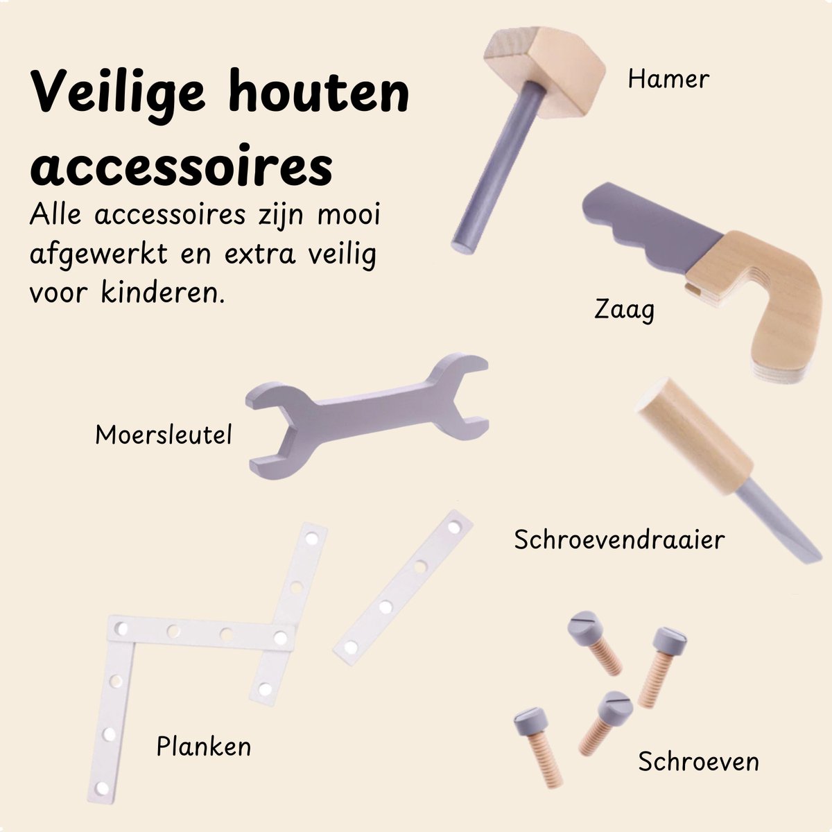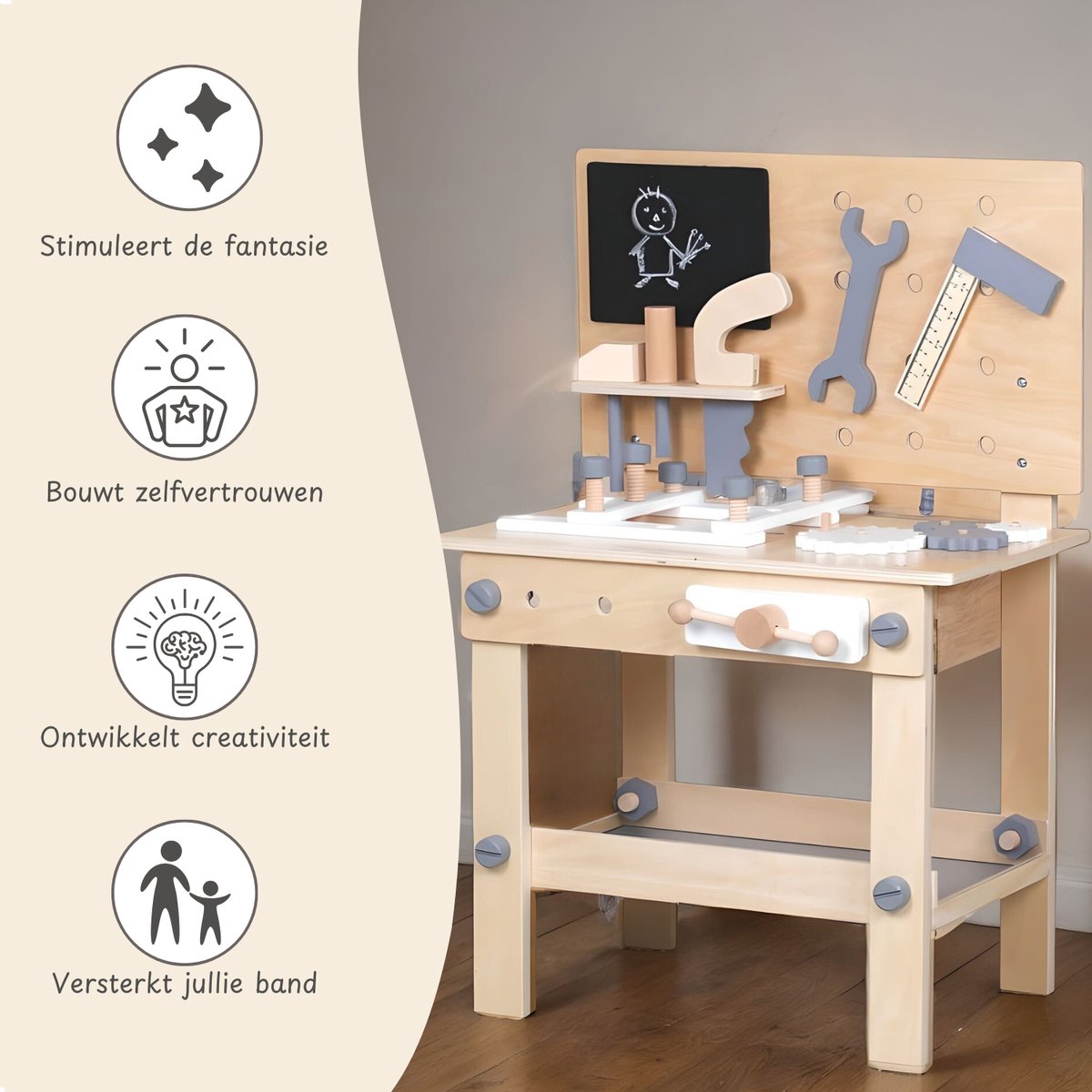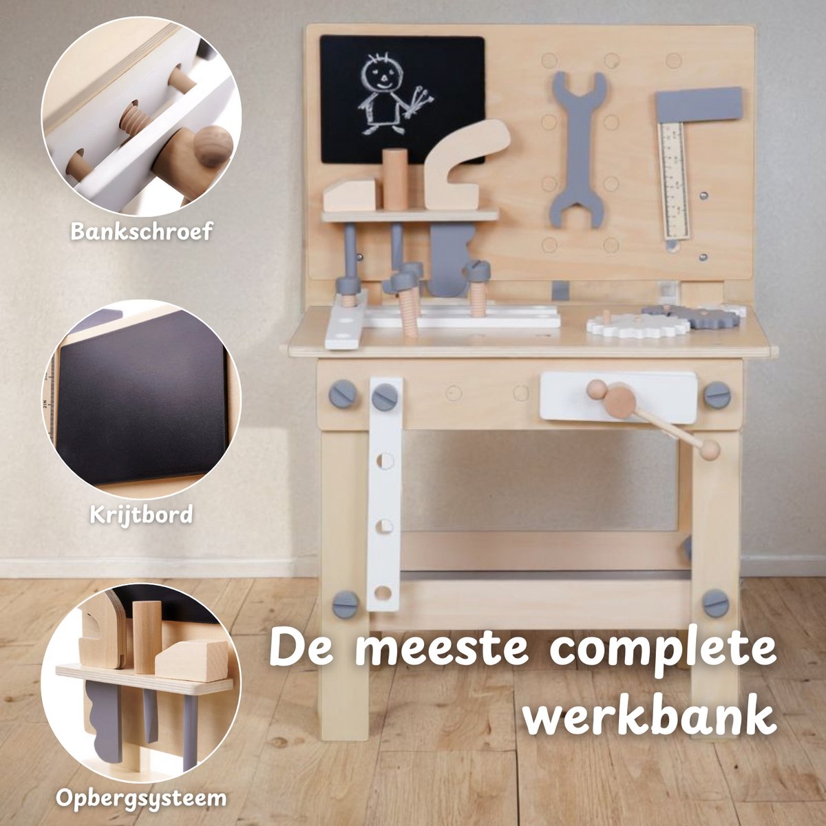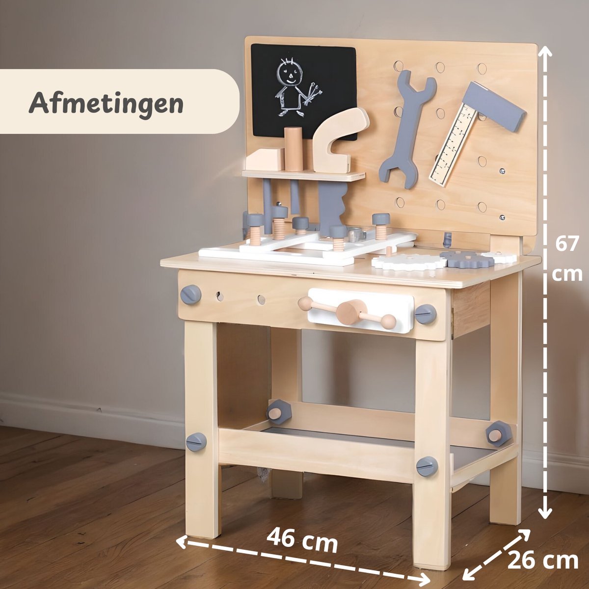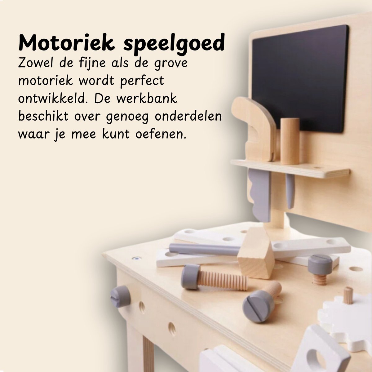 Het kiezen voor speelgoed van hout brengt verschillende voordelen met zich mee. Zo is hout robuust, weerbestendig en licht. Daarbij komen er bij het productieproces van houten speelgoed geen schadelijke stoffen vrij. Dit is bij het maken van bijvoorbeeld plastic speelgoed wel degelijk aan de orde. Een ander voordeel is dat hout langer mee gaat en biologisch afbreekbaar is. Omdat er in houten speelgoed geen schadelijke stoffen verwerkt zijn, is het ook nog eens gezonder voor jouw kindje. Speelgoed is echter niet alleen om mee te spelen maar het stimuleert ook de ontwikkeling en de sociale vaardigheden van jouw kleintje. Doordat de werkbank ook veel kleine onderdelen heeft om vast te pakken gaat de motoriek van jouw kleintje er ook op voorruit.