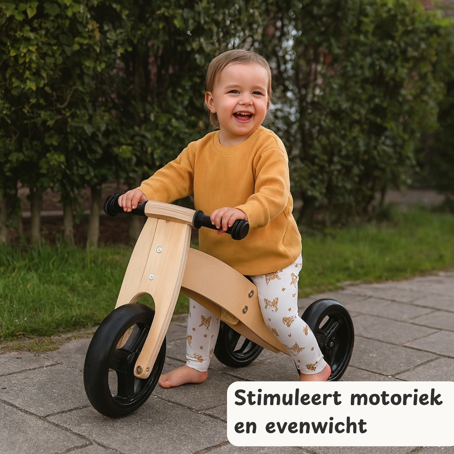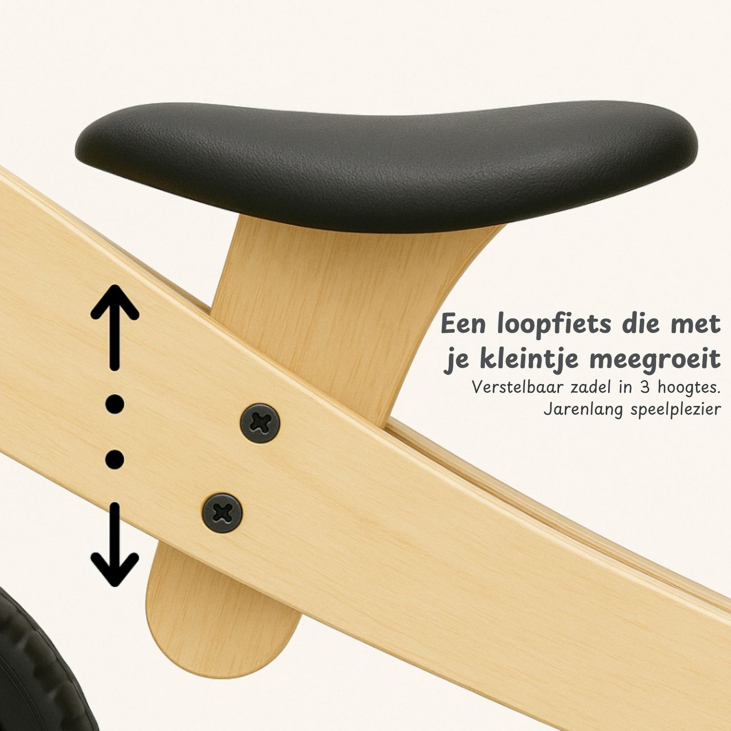 De houten balance loopfiets zorgt niet alleen voor uren speelplezier. Het zorgt er ook voor dat jouw kindje leert omgaan met het vinden van balans en motoriek. Wat is er fijner dan op spelenderwijs de wereld te leren kennen en je zelf te ontwikkelen. De fiets zorgt er ook voor dat jouw kindje de stap naar een fiets met trappers goed afgaat. De rubberhandvaten met eindstukjes zorgen er voor dat jouw kleine veilig op pad kan.