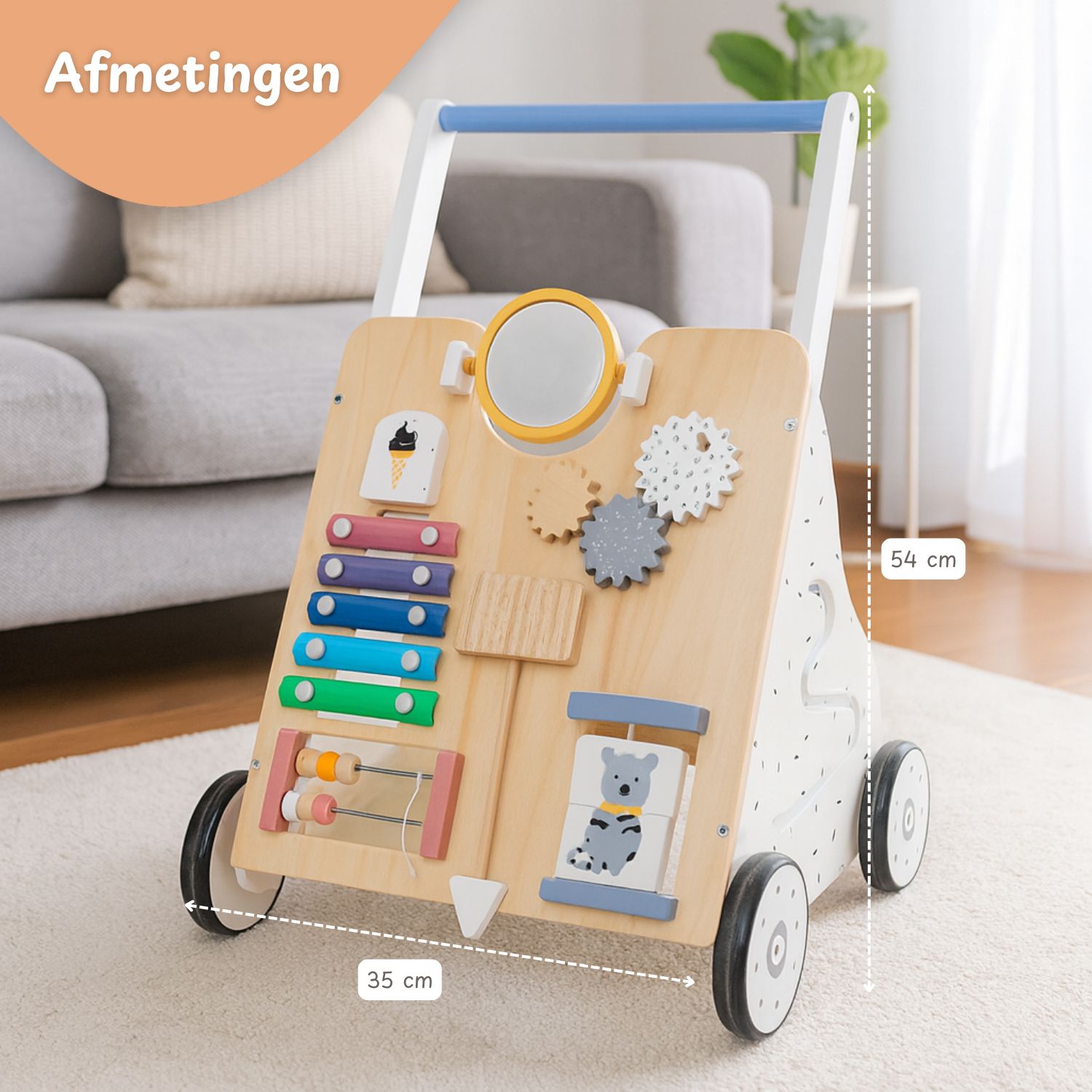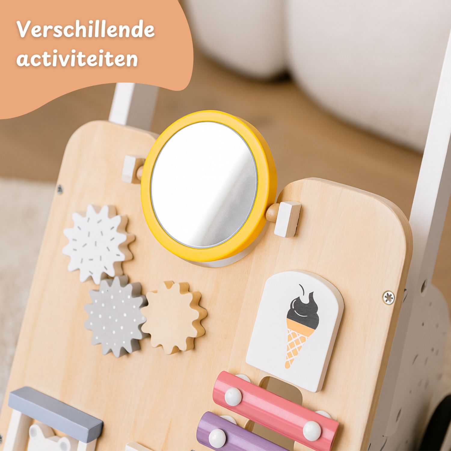 Deze leuke loopwagen is voorzien van talloze speelmogelijkheden; een spiegeltje om jezelf te zien lopen, een gekleurd telraam waarop het kind zijn eerste stapjes kan tellen met mama en papa, een drietal draaischijven voor de kleine om spelenderwijs te leren over verschillende vormen en richtingen, een teddybeer die kan worden gedraaid zodat zijn rompje van plek verandert en een kleurrijke xylofoon om de leukste melodieën mee te maken.