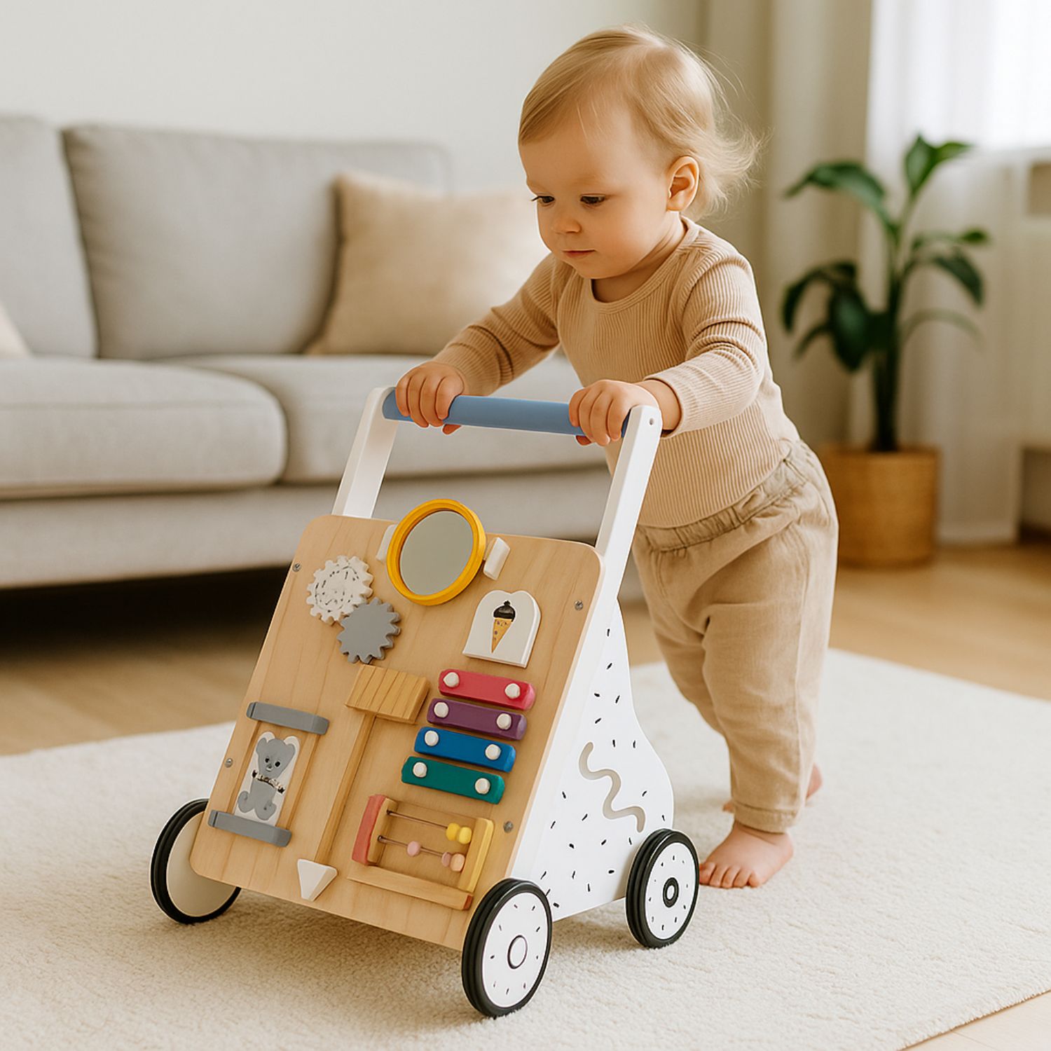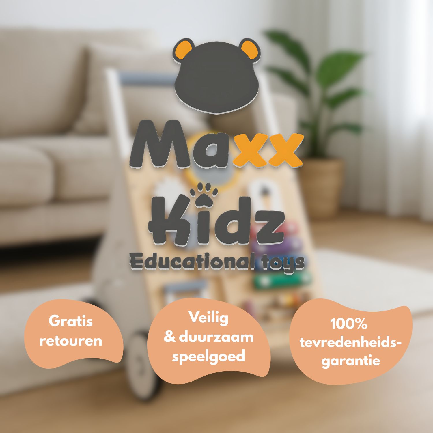Leert jouw kleine ook lopen met dit gave loopwagentje van Maxxshop? Spelen was nog nooit zo leuk en leerzaam met deze vrolijke baby walker. Deze duw wagen heeft vele spelletjes en activiteiten aan boord voor uren speelplezier. Leer al spelenderwijs alles over vormpjes, kleuren, dieren en getallen. Het gebruik van multiplex en rubberen banden maakt van deze wagen een robuust geheel. De looptrainer is het perfecte hulpmiddel voor jouw kleintje om zijn eerste stapjes te leren zetten.