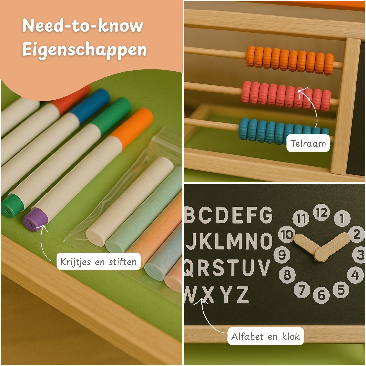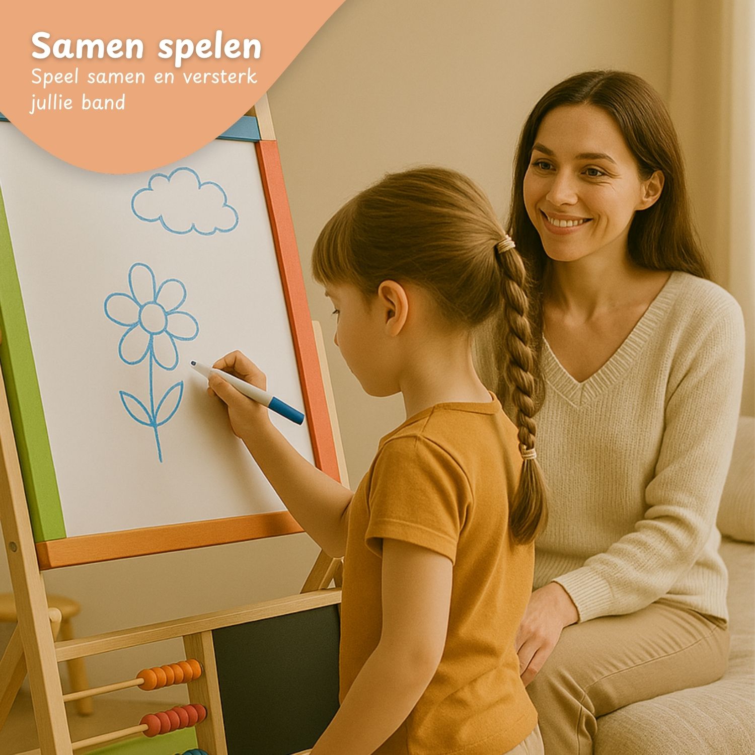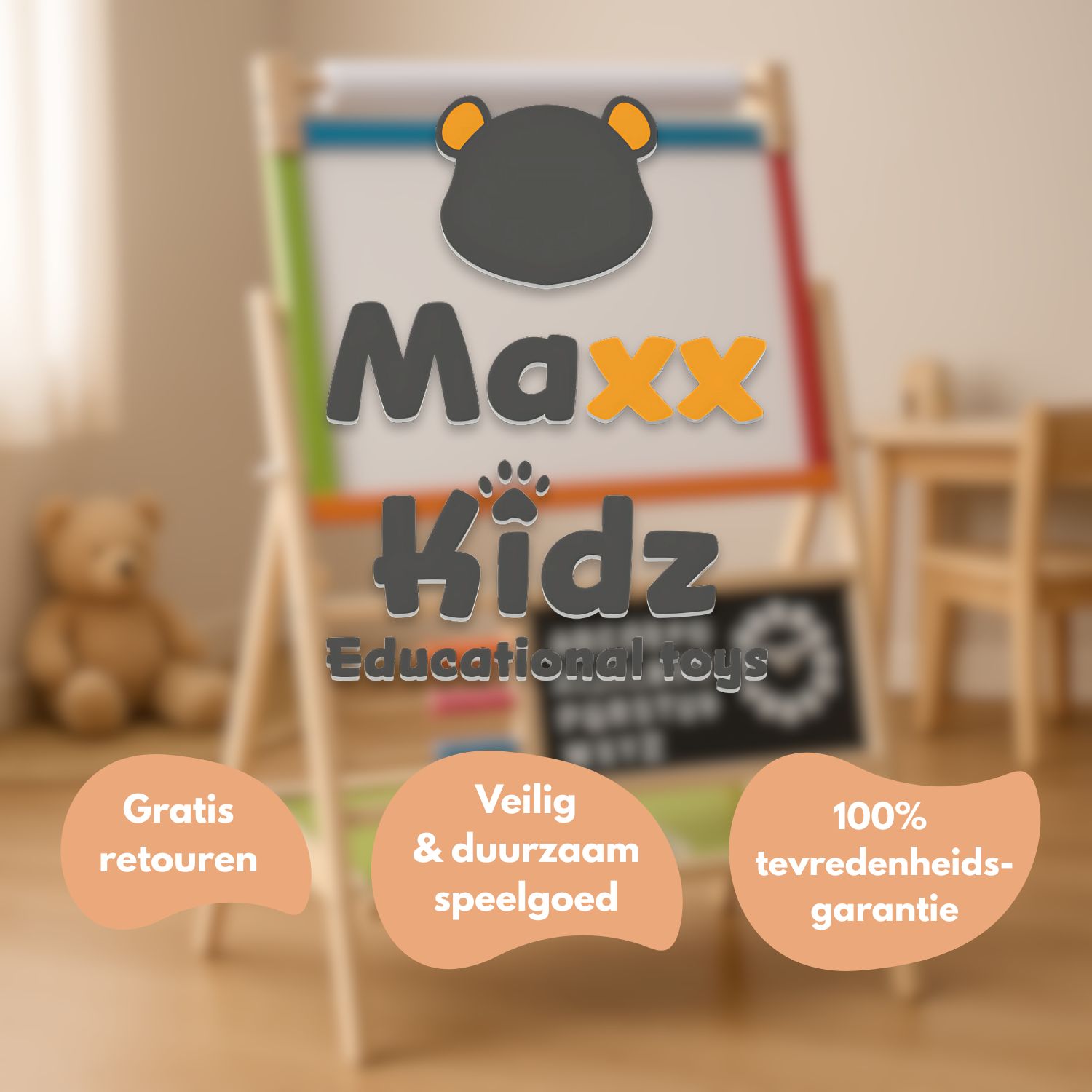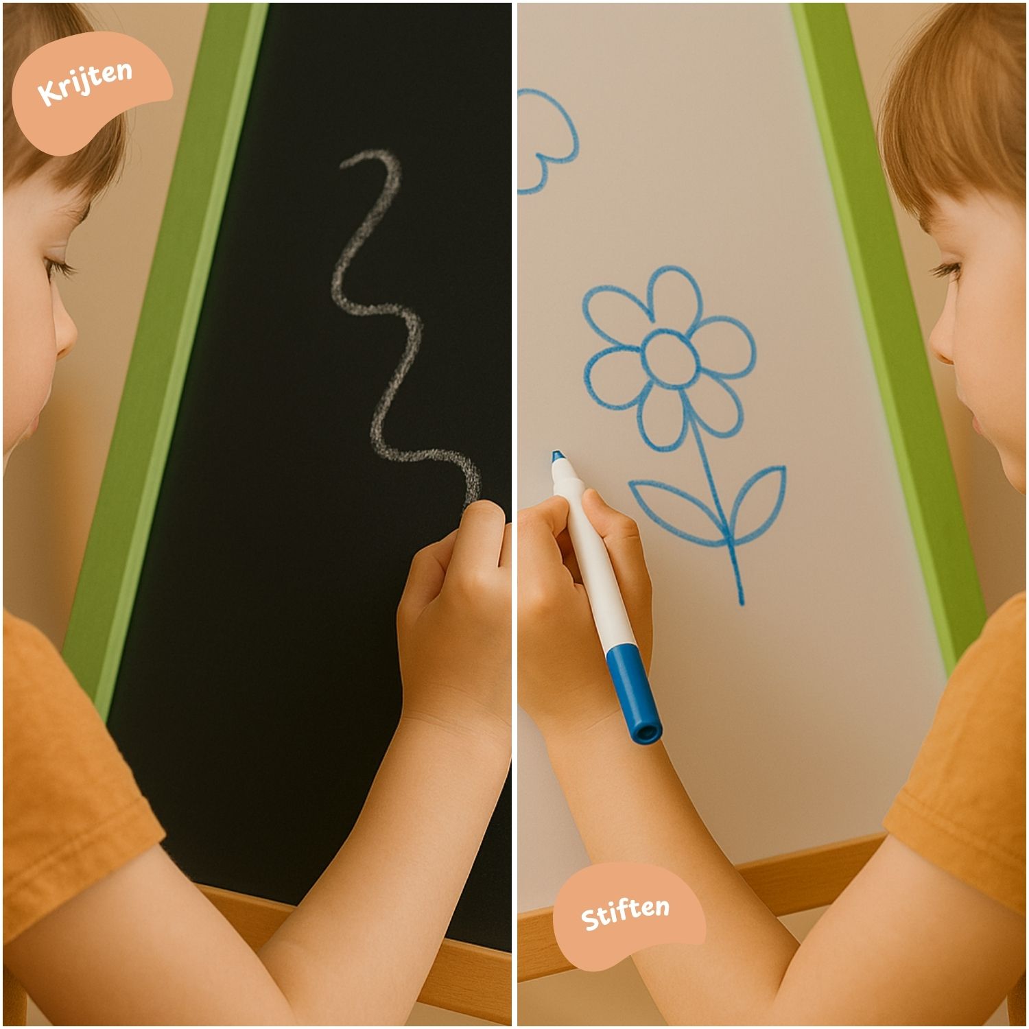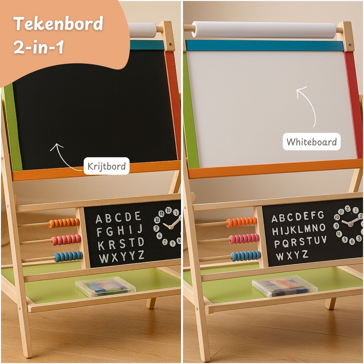Laat de fantasie de vrije loop! Met het nieuwe houten tekenbord van Maxxshop staat jouw kleine te popelen om naar school te gaan. Dit houten schoolbord heeft twee kanten. Eén kant is een whiteboard en de andere kant is een blackboard. Met het houten schoolbord leert jouw kind schrijven met de meegeleverde stiften en krijtjes. Dit is vervolgens simpel uit te vegen met de spons die ook in de doos zit. Hiernaast leert hij of zij ook optellen en aftrekken met het telraam die in het frame van het bord zit gemonteerd. Aan de rechterkant zit ook een klok. Deze kan worden gebruikt voor het leren van klok kijken. Door de verschillende kleuren van het schoolbord geeft dit een unieke frisse uitstraling.
