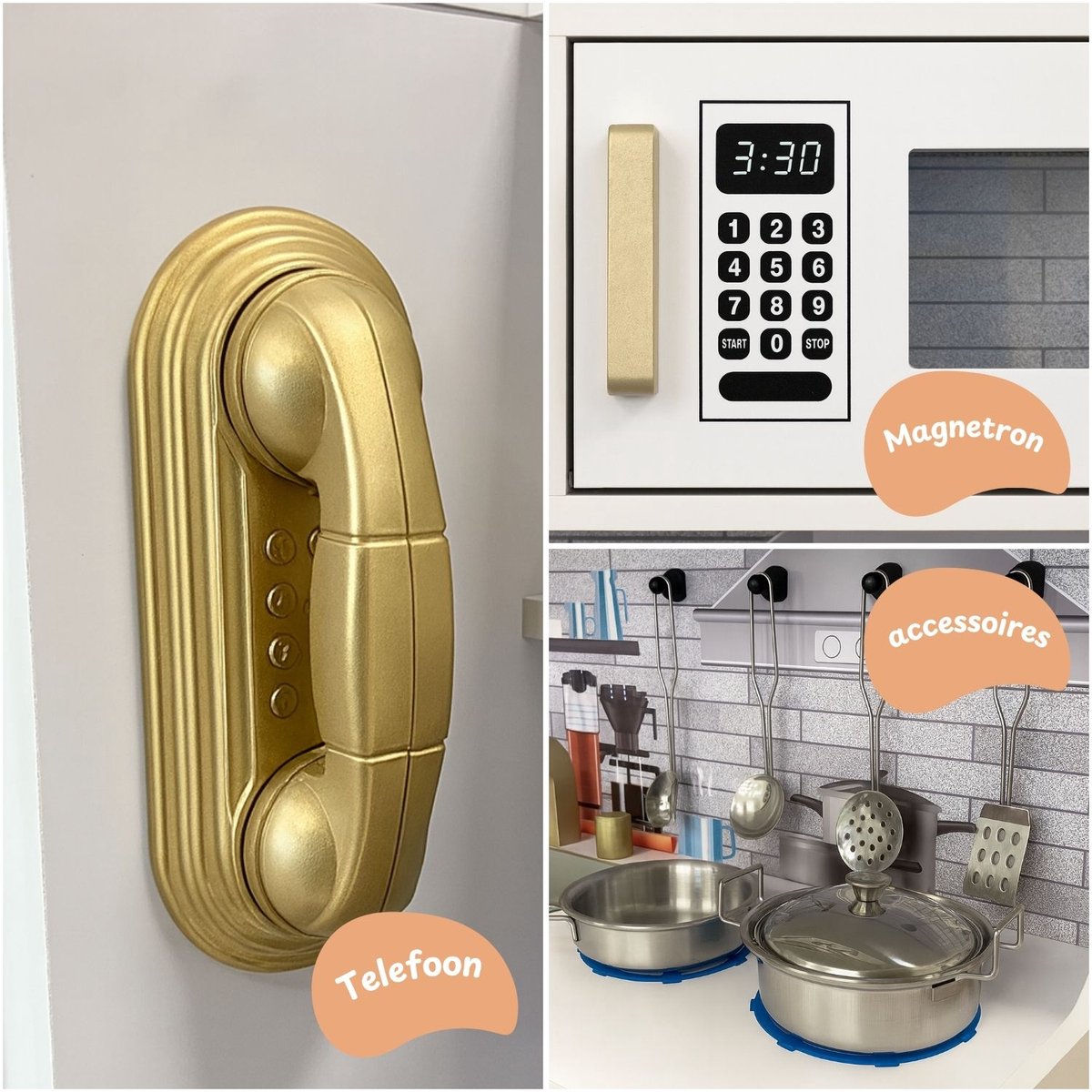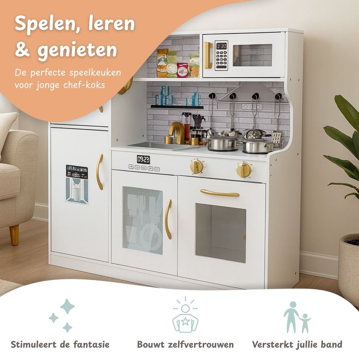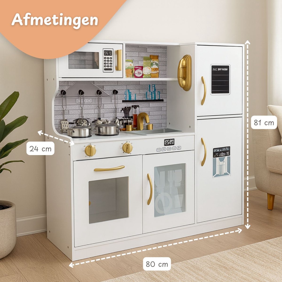 Bij de speelgoed keuken zitten meerdere opbergvakken. Hierdoor is er de mogelijkheid om de ingrediënten goed te bewaren. Voor snelle opwarmmaaltijden is er een ingebouwde magnetron. Perfect voor het opwarmen van een pasta. Maar voor het opwarmen van een goede lasagne is de magnetron net iets te klein. Hiervoor is er ook een oven tot de beschikking. Dus maak je klaar voor uren speelplezier met het tijdloze speelgoed keuken van Maxxshop!