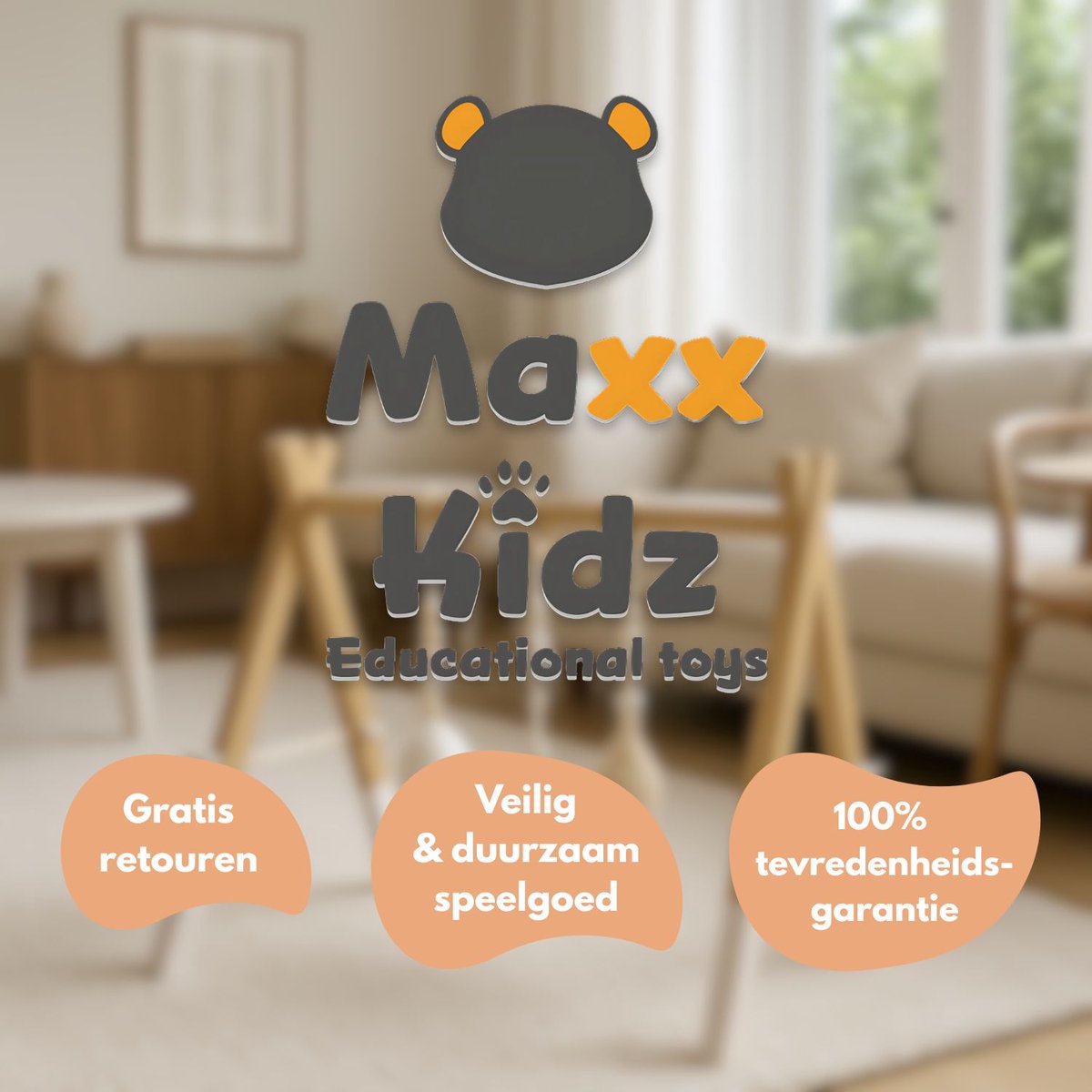 Stimuleer de motorische vaardigheden van jouw kleine in de eerste levensmaanden met de houten babygym van Maxx Kidz inclusief 5 speeltjes! is jouw kind al vroeg onbewust bezig met de hand-oog coördinatie. Door de ruime afmetingen is er voldoende ruimte voor maar liefst vijf babygym speeltjes. Hiervan zijn twee knuffels die door middel van schudden of knijpen een geluidje maken! Dit motiveert om telkens opnieuw naar de knuffels te grijpen. De drie andere speeltjes hebben allemaal hun eigen grijpgedeelte met ieder z’n eigen moeilijkheidsgraad. Dit werkt goed op de fijne motoriek wanneer dit vroeg in de eerste levensmaanden wordt gestimuleerd.