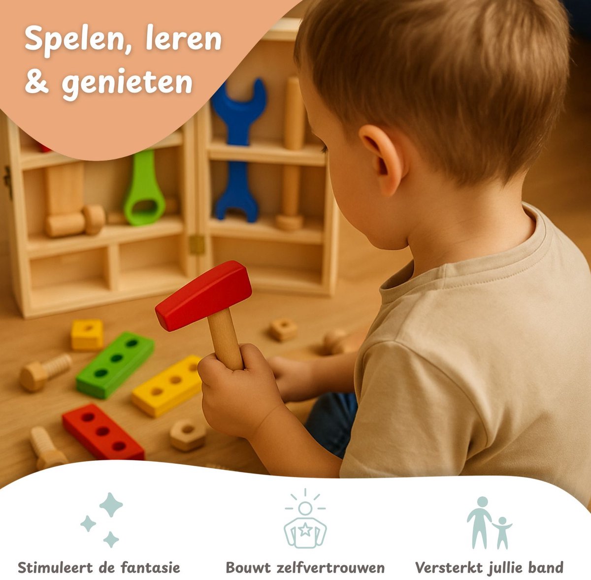 Deze houten gereedschapsset voor kinderen combineert educatief leren met eindeloos speelplezier. Door te schroeven en te timmeren ontwikkelen kinderen niet alleen hun motoriek, maar ook hun probleemoplossend vermogen. Dankzij het stevige houten ontwerp en de vrolijke kleuren is dit speelgoed tijdloos, duurzaam en leuk voor jarenlang speelplezier!