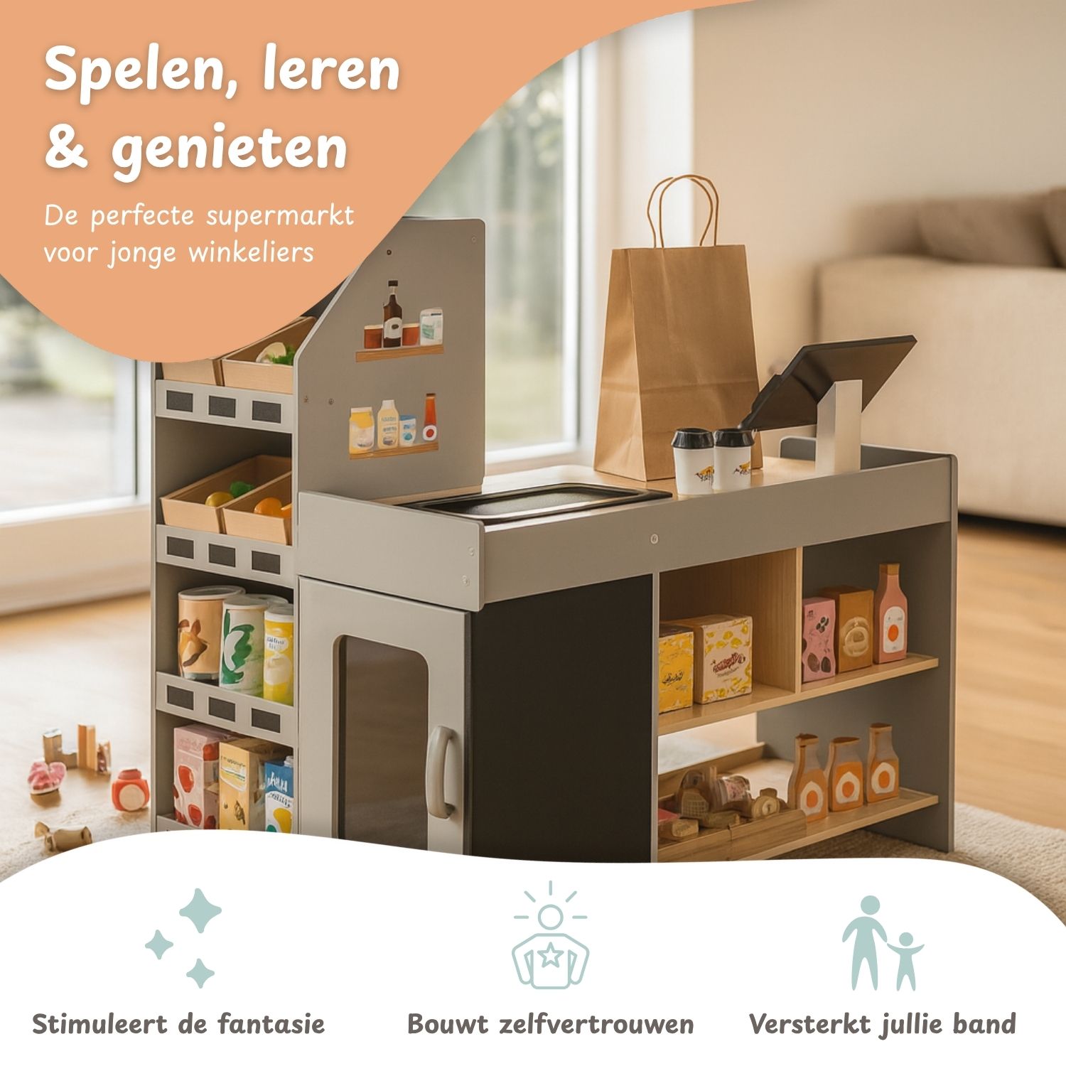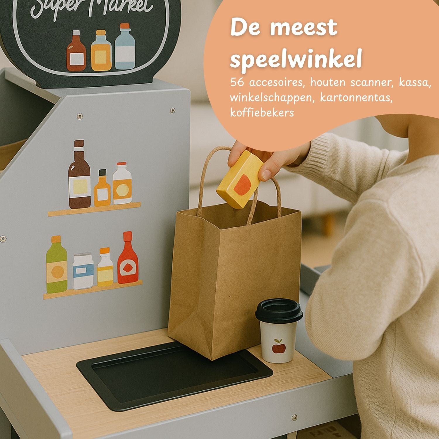 Breng de magie van een eigen supermarkt in huis en laat kinderen genieten van eindeloos speelplezier met dit prachtige houten kinder marktje!
