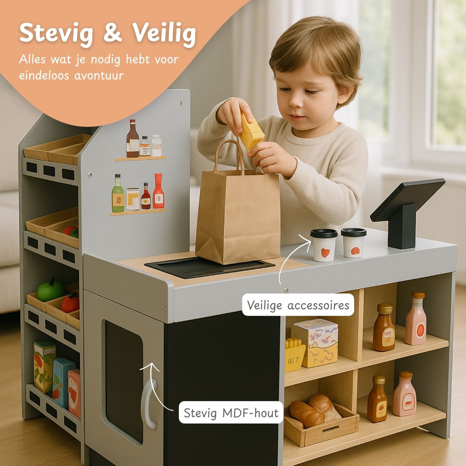 Met dit houten kinder-marktje haal je een complete mini supermarkt in huis. Kinderen kunnen hun fantasie de vrije loop laten terwijl ze producten uitstallen, klanten helpen en afrekenen bij de kassa. Het stevige houten ontwerp en de realistische details maken dit speelgoedwinkeltje een absolute favoriet in elke speelkamer.