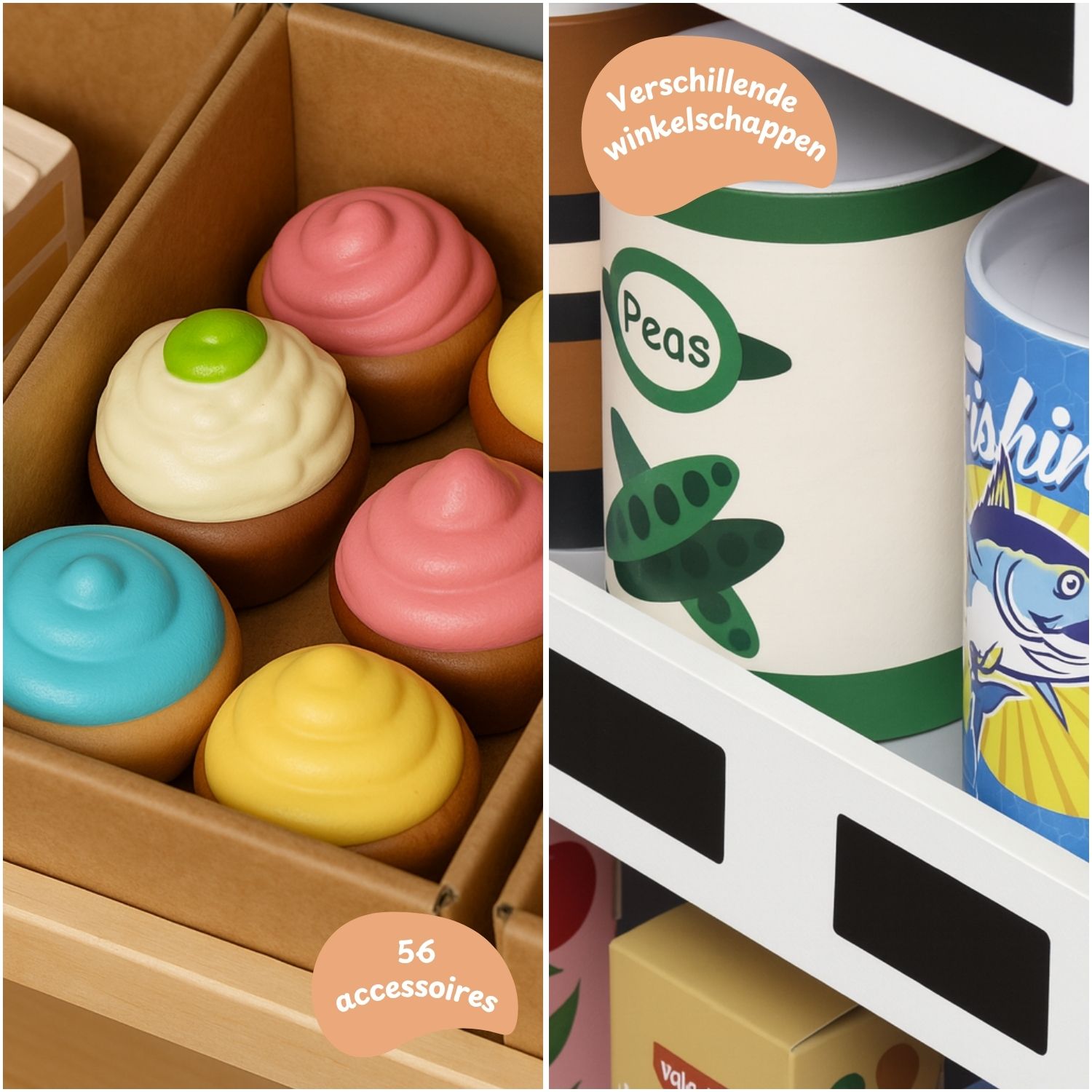 Het marktje wordt geleverd met diverse houten boodschappen, zoals melk, sap, blikjes, brood en gebak. De schappen en vakken bieden volop ruimte om producten uit te stallen. Dankzij de bijgeleverde kassa, pinapparaat en papieren boodschappentas wordt het rollenspel extra echt. Zo voelt het net alsof kinderen een échte supermarkt runnen.