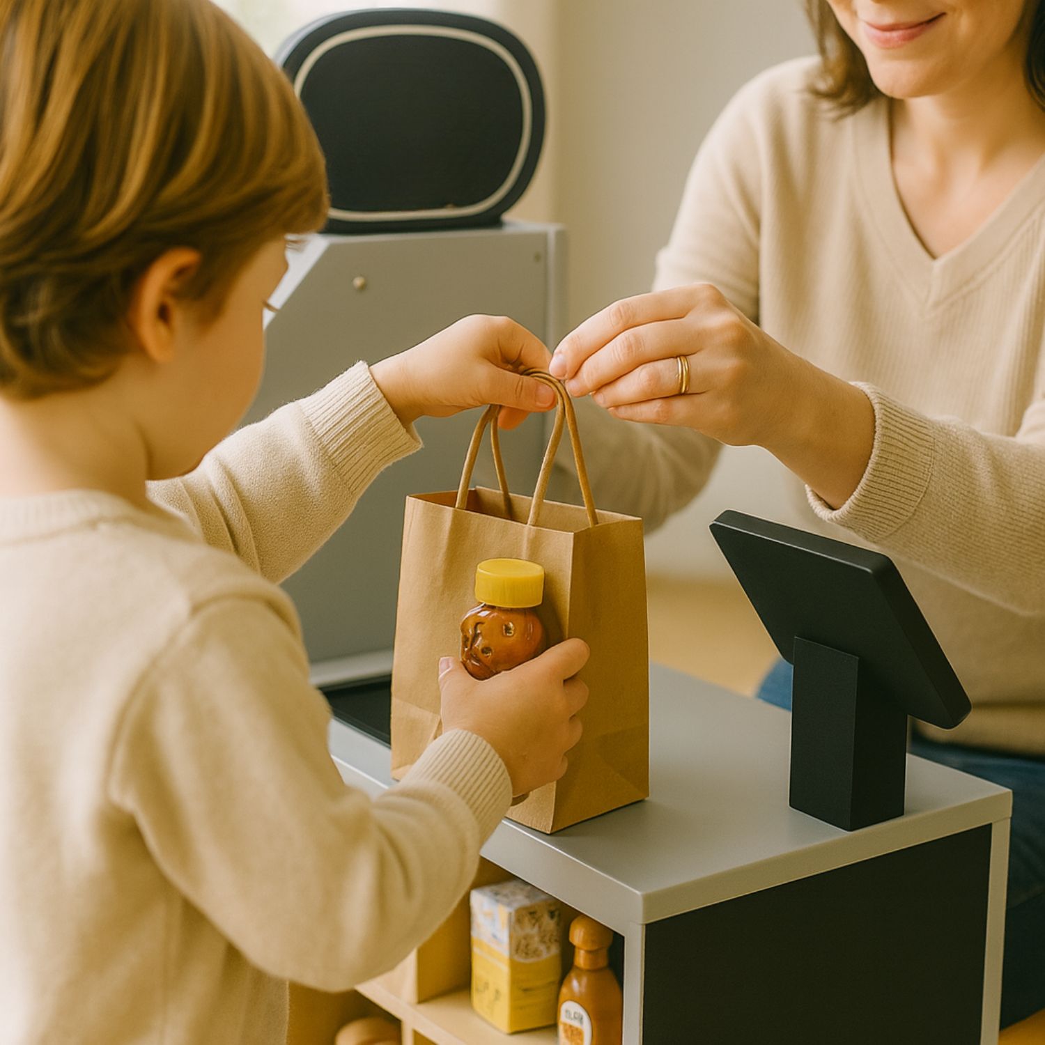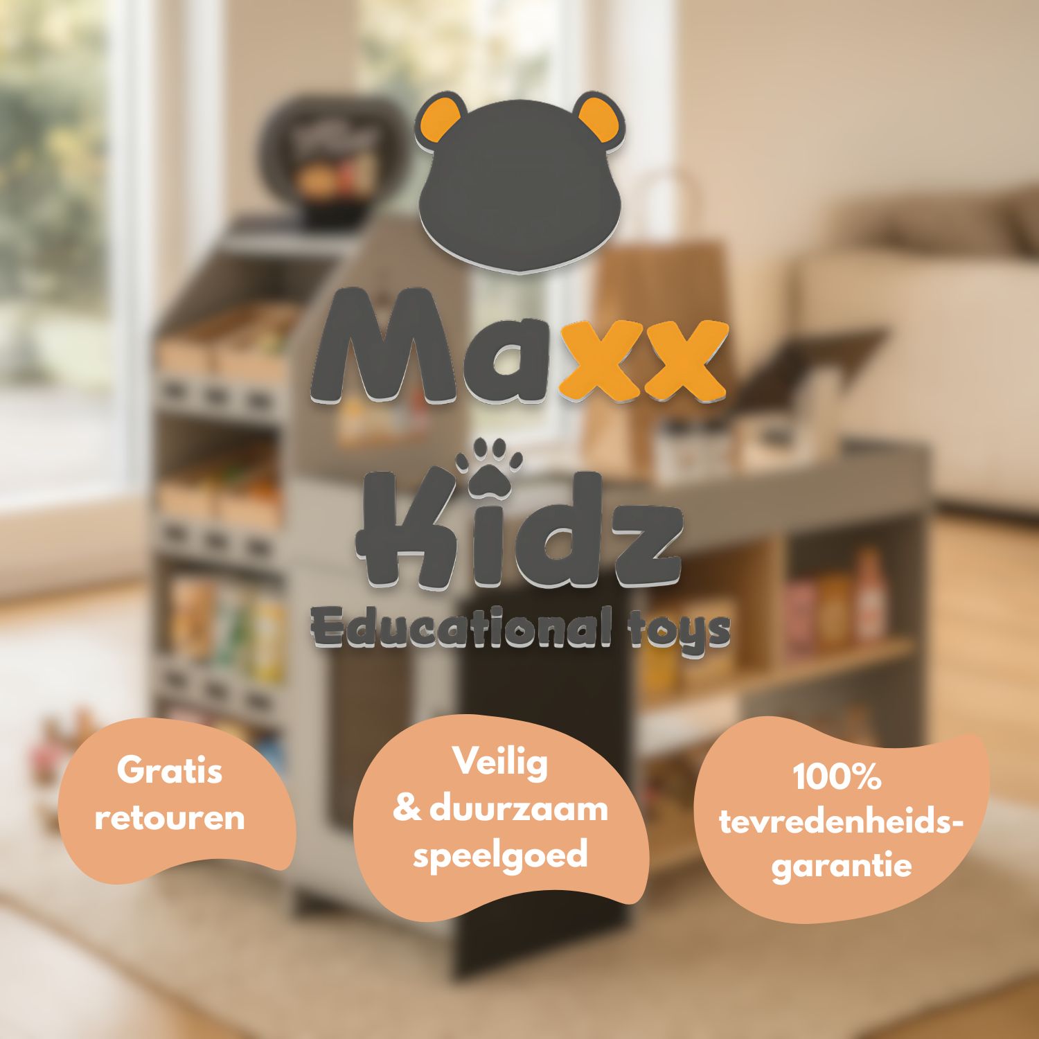 Dit educatief houten speelgoed is meer dan alleen leuk. Het stimuleert creativiteit, rollenspel en sociale interactie. Terwijl kinderen winkeltje spelen, leren ze tellen, omgaan met geld en samenwerken met anderen. Het marktje is ideaal om samen met vriendjes, broertjes of zusjes te spelen, maar ook alleen blijft het uitdagend.