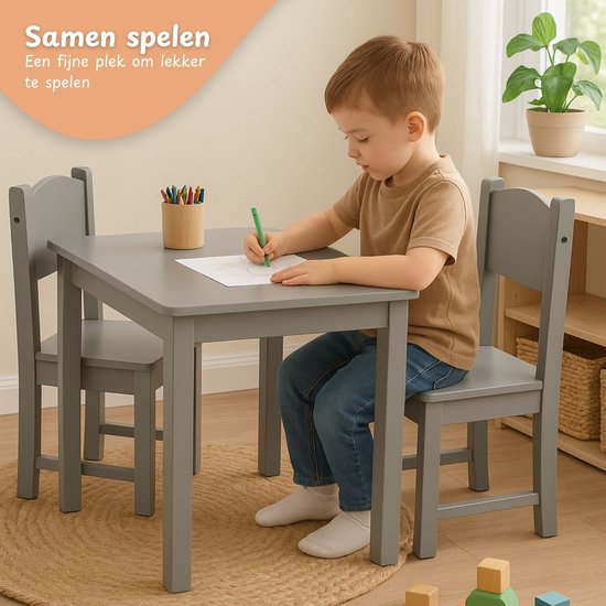 Deze Houten kindertafel met 2 stoeltjes heeft niet alleen een zachte uitstraling, maar zijn ook nog eens ontzettend comfortabel! Met de nieuwe kindertafel en stoeltjes van Maxx Kidz, kun jij je kleine uren lang aan het spelen zetten! Door de grijze kleur past deze kindertafel met 2 stoelen in iedere kinderkamer. Ideaal te gebruiken wanneer je kind vriendjes over vloer heeft en deze lekker willen tekenen of knutselen. De hoogte van de twee stoeltjes past precies bij de tafel wat voor optimaal zitcomfort zorgt. Gun jouw kleine een eigen werkplek net zoals papa. Zo gaat je kind zijn ouders imiteren en helpt dit mee met de ontwikkeling.