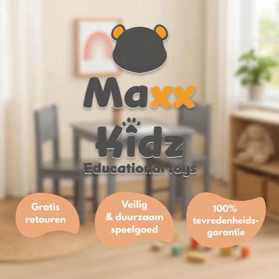 Maxxshop staat bekend om zijn houten speelgoed. Doordat het grootste gedeelte van ons assortiment uit hout bestaat, gebruiken wij hiervoor MDF-gecertifieerd hout. Zo zorgen wij voor een veilige speelervaring met ons speelgoed  en dus ook de kindertafel met stoeltjes. Jouw kleine kan zijn stoel zelf aanschuiven door middel van lichte materialen. Hierdoor is jouw kleine ook nog eens bezig met zijn motorische vaardigheden.