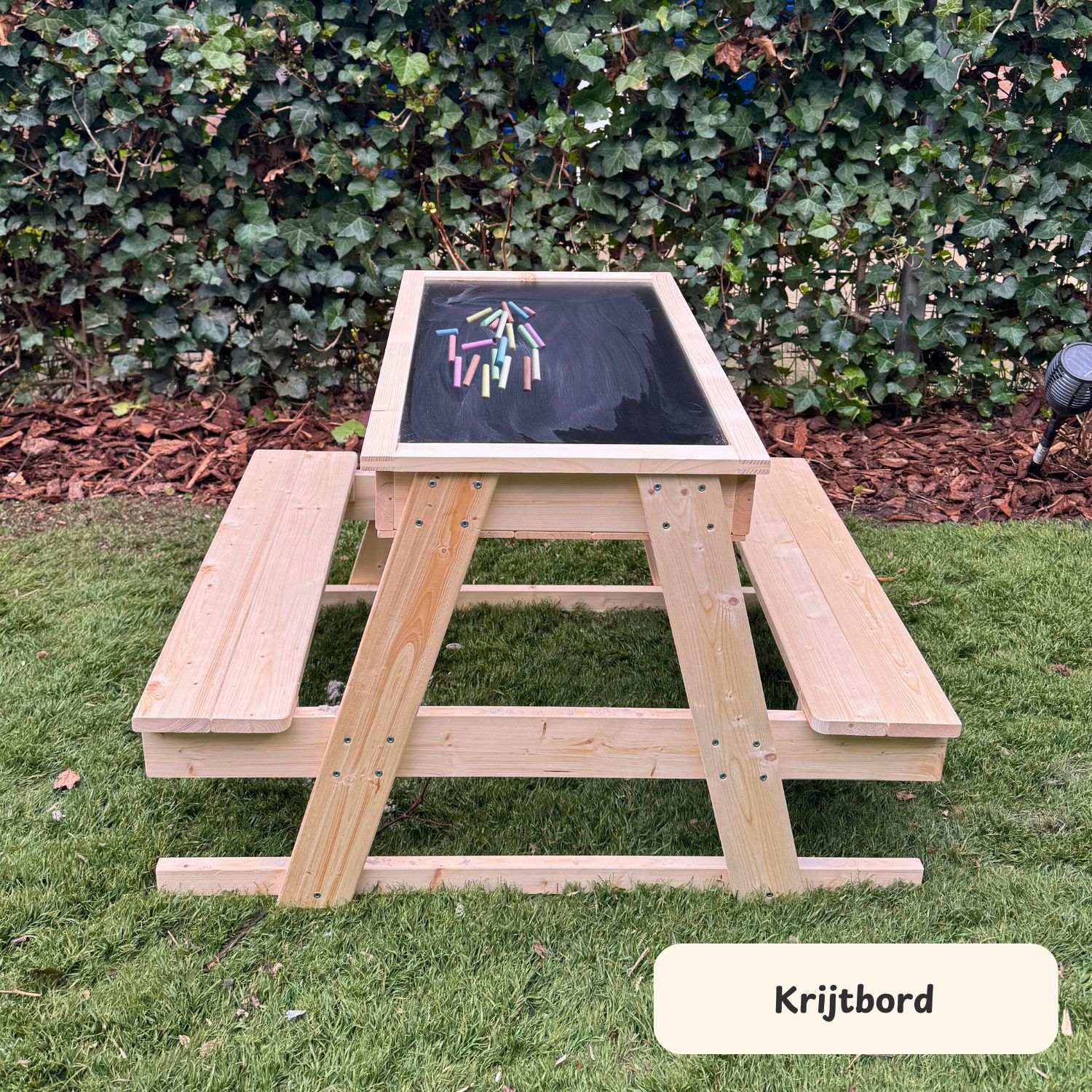 Ontdek de voordelen van de 3 in 1 houten picknicktafel van Maxx Kidz met zandbak en krijtbord! Het ideale houten speelgoed zodat jouw kleine zich uren achter elkaar kan vermaken. Zo is de kinderpicknicktafel ideaal voor het knutselen ,tekenen maar vooral creatief bezig zijn. Met de 4 zitplaatsen kan jouw kind met meerdere vriendjes of vriendinnetjes tegelijk bezig zijn en elkaar stimuleren om de creativiteit de vrije loop te gaan! Buiten de picknicktafel bevat dit houten kindermeubel ook een geïntrigeerd tekenbord. Wanneer je het tafelblad omdraait, veranderd het picknicktafeltje in een multifunctionele knutseltafel! Door het lichte gewicht is hij ook gemakkelijk van binnen naar buiten te verplaatsen. Zo kan je als ouder zijnde altijd een oogje in het zeil houden!